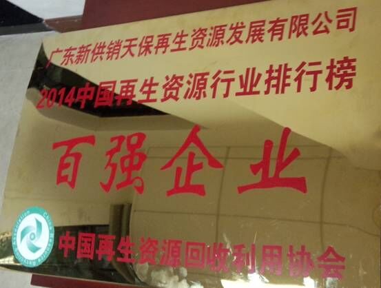 会上由中国再生资源回收利用协会公布了“2014中国再生行业百强企业排行榜”,并为前十强企业授牌,广东新供销天保再生资源发展有限公司为2014年度排行第八名。