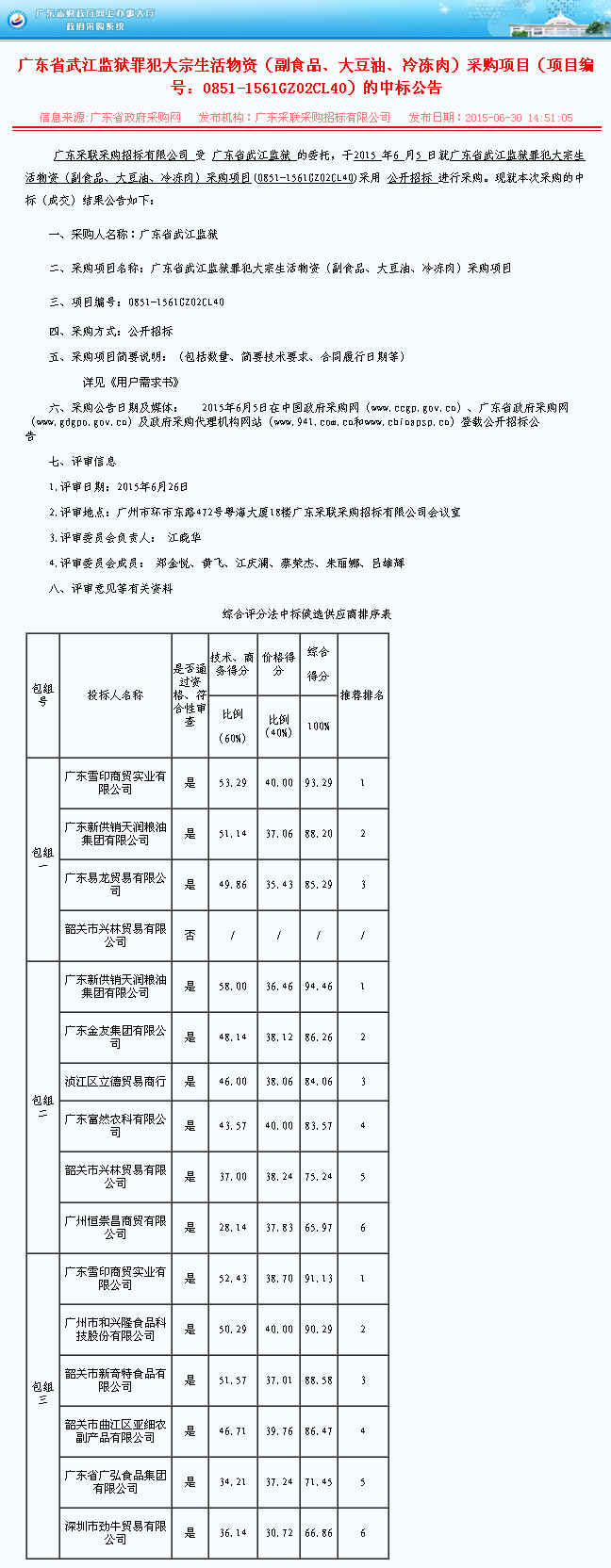 广东省武江监狱罪犯大宗生活物资(大豆油)采购项目是广东省武江监狱委托广东采联采购招标有限公司,于2015年6月5日采用公开招标的方式进行采购的项目。经评审委员会评审,天润粮油集团公司以综合得分第一名的成绩获推荐为该项目包组二(大豆油)的中标供应商。