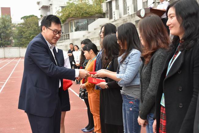 钟劲东校长、周永生副校长、李广乾副校长、吴瑞明副校长分别为获奖的班级、优秀班主任颁奖。