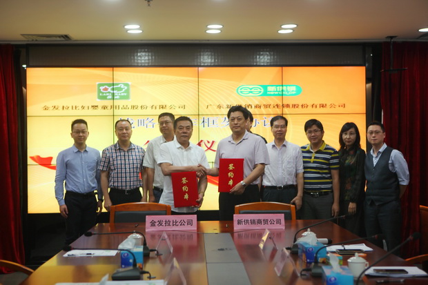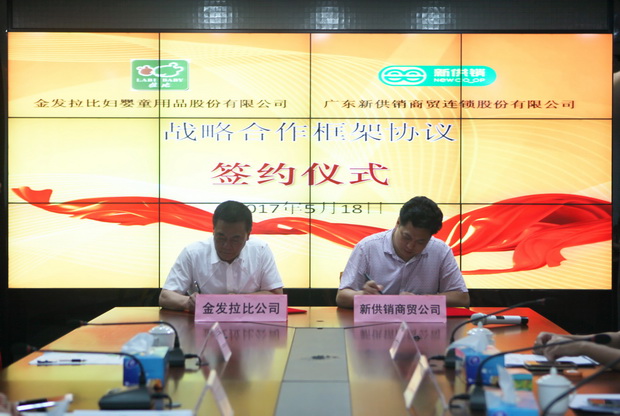 5月19日上午,新供销商贸公司与A股第一家母婴上市企业金发拉比妇婴童用品公司在新供销商贸公司总部举行了战略合作框架协议签约仪式,省社综合业务处处长张伟龙,金发拉比公司董事长林浩亮、副董事长汤典勤一行及商贸公司董事长黄庆福等出席了签约仪式。