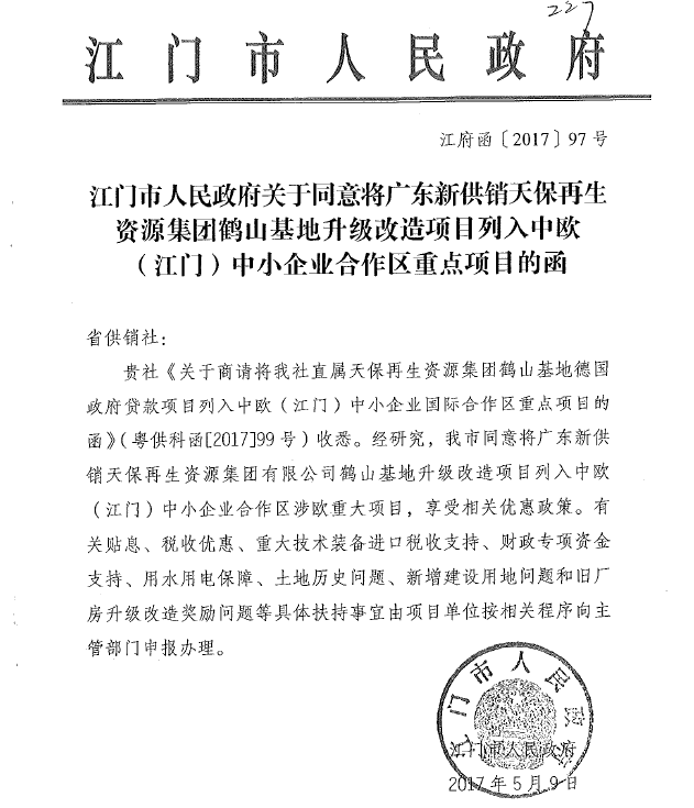 近日,我司鹤山基地升级改造项目传来捷报,江门市人民政府正式发函同意将我司鹤山基地升级改造项目列入中欧(江门)中小企业合作区重点项目,这将为鹤山基地的纵深发展迎来重大发展机遇。
